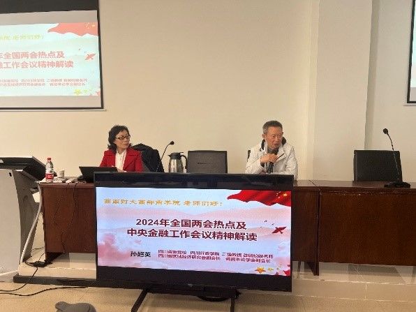 邀请四川省委党校、四川行政学院二级教授、首届校级名师、四川省突出贡献优秀专家、省区域经济研究会副会长孙超英,在学院新办公区大会议室,为全体教职工作题为《2024年两会热点及中央金融工作会议精神解读》专题辅导。专题辅导会由学院党总支书记文洪毅主持,全体教职员工参加学习。